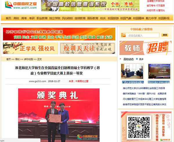 【中国高校之窗】淮北师范大学师生在全国首届全日制教育硕士学科教学(思政)专业教学技能大赛上喜获一等奖 来源:党委宣传部 发布时间:2018-11-27 09:27:33 浏览次数: 次 【字体:小 大】 11月27日,《中国高校之窗》报道我校师生在全国首届全日制教育硕士学科教学(思政)专业教学技能大赛上喜获一等奖 。链接地址:http://www.gx211.com/news/20181127/n15432904728780.html 分享到: 【打印正文】