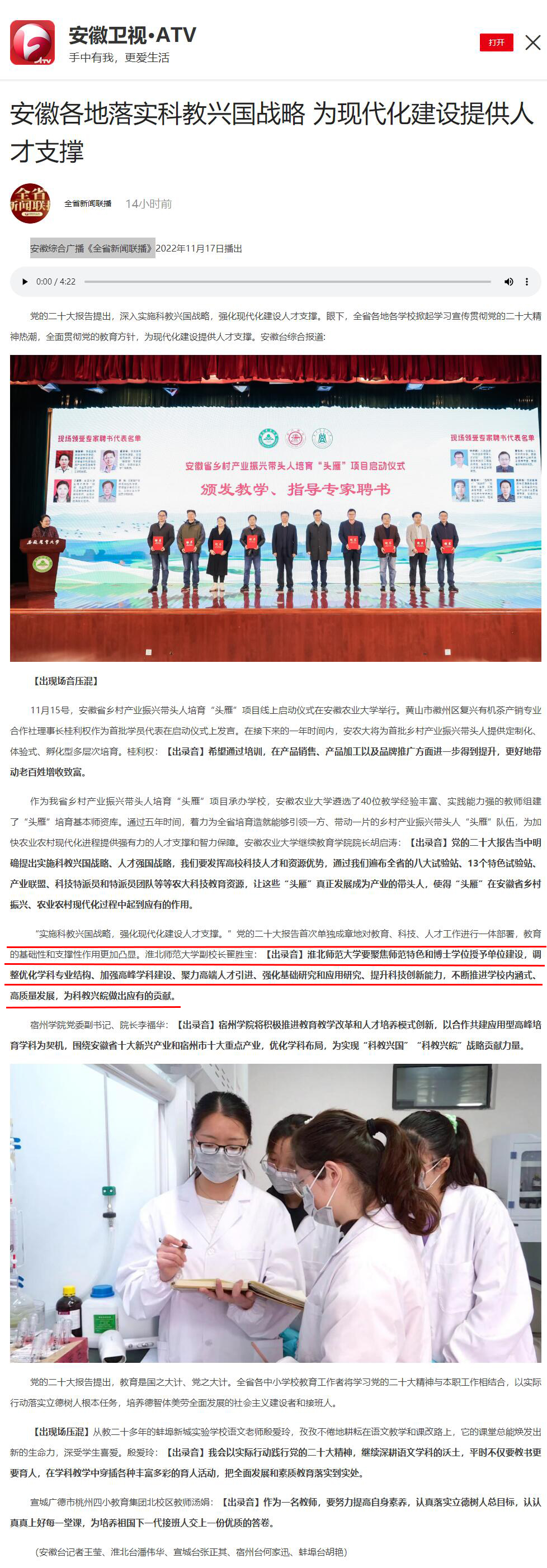 【学习贯彻党的二十大精神】《安徽新闻联播》《全省新闻联播》报道我校落实科教兴国战略 为现代化建设提供人才支撑