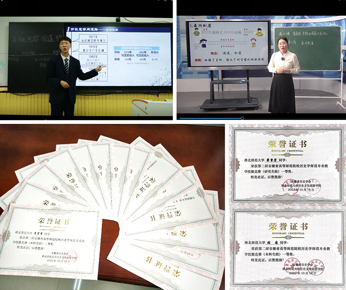 本次大赛分为本科生组和研究生组两组进行。共收到来自安徽师范大学历史学院、安庆师范大学人文学院、阜阳师范大学历史文化与旅游学院、池州学院旅游与历史文化学院、淮北师范大学历史文化旅游学院等省内5所院校53名选手参赛作品。参赛作品包括“说课”与“讲课”两个环节,重点考查选手的教育理念、课标理解、学情与教材分析、教学内容设计与教学实施等技能,意在锻炼和展示选手的历史教学基本功、教学实践能力和课程思政能力。本次大赛邀请了来自全国各中学的一线优秀教师及各高校教学名师16人担任评委。经过激烈的角逐,最终决出4所院校的8名选手获得一等奖,6名教师获优秀指导教师奖。我校历史文化旅游学院张园、梁雪芳同学分别荣获本科生组、研究生组一等奖。