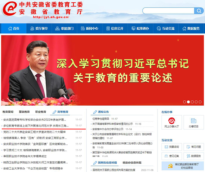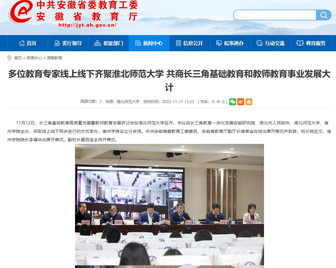 11月12日,长三角基础教育高质量发展暨教师教育发展研讨会在淮北师范大学召开。会议由长三角教育一体化发展安徽研究院、淮北市人民政府、淮北师范大学、宿州学院主办,采取线上线下同步进行的方式举办,宿州学院设立分会场。中国网、安徽教育网首页对此进行了报道