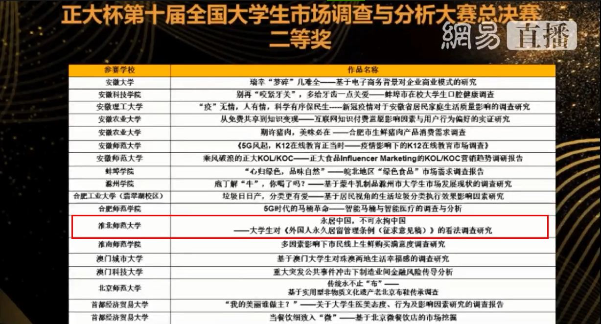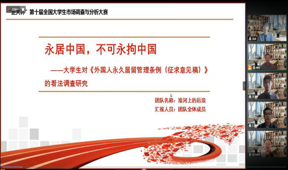 决赛中,由胡小亮、赖贵沿、贾惠雯、迟浩杰和陈阳(指导老师:牛翠萍、王国华)组成的“淮河上的后浪”队精心准备,积极应答,表现出色,其作品《永居中国,不可永拘中国——大学生对〈外国人永久居留管理条例(征求意见稿)〉的看法调查研究》荣获国赛二等奖;由干佳丽、胡晗、孙超、李艳萍和余雯(指导老师:李翼)组成的“研之有理”队及其作品《“心有戒尺,方有敬畏”——基于教育惩戒权的文本挖掘与淮北市的抽样调查》荣获国赛三等奖。此外,由胡海鹏同学(指导老师:牛翠萍、李翼)负责的“火箭动力”队及其作品《“桥为流水等待,奶茶因你而香甜”——大学生校园奶茶消费现状研究》荣获省级三等奖。