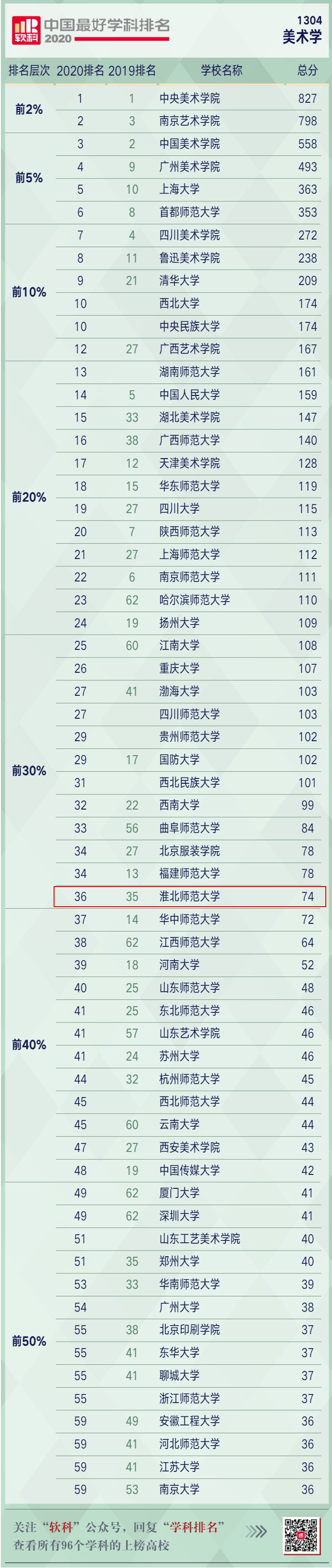 2020软科中国最好学科排名:美术学 来源:学科建设与发展规划处 发布时间:2020-10-16 16:16:47 浏览次数: 次 【字体:小 大】 2020软科中国最好学科排名:美术学高等教育评价专业机构软科10月15日正式发布“2020软科中国最好学科排名”,排名榜单包括96个一级学科。美术学学科排名共有62所大学上榜,淮北师范大学位列前30%。 分享到: 【打印正文】