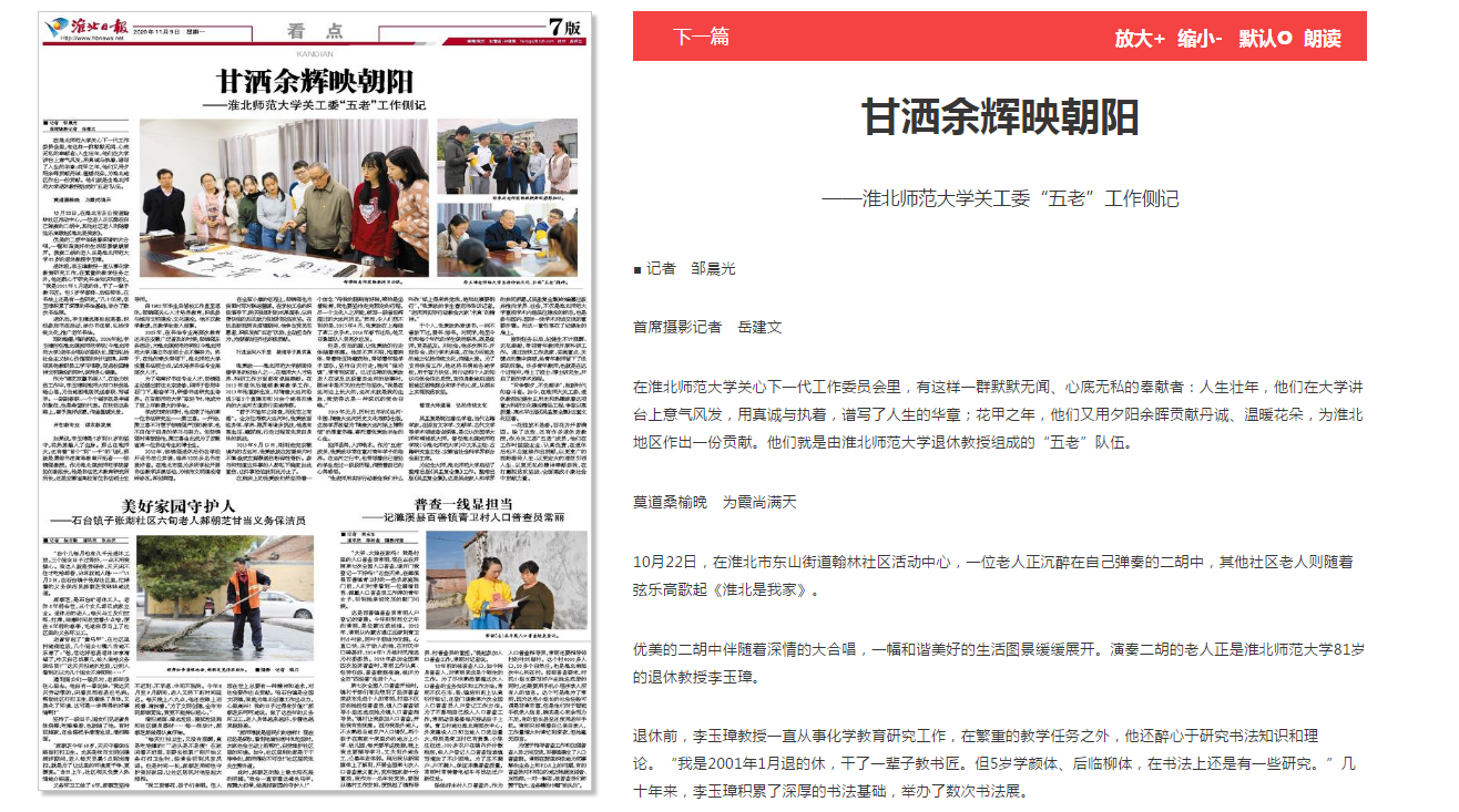 今日,《淮北日报》《淮北新闻联播》全面报道淮师大关工委“五老”事迹。