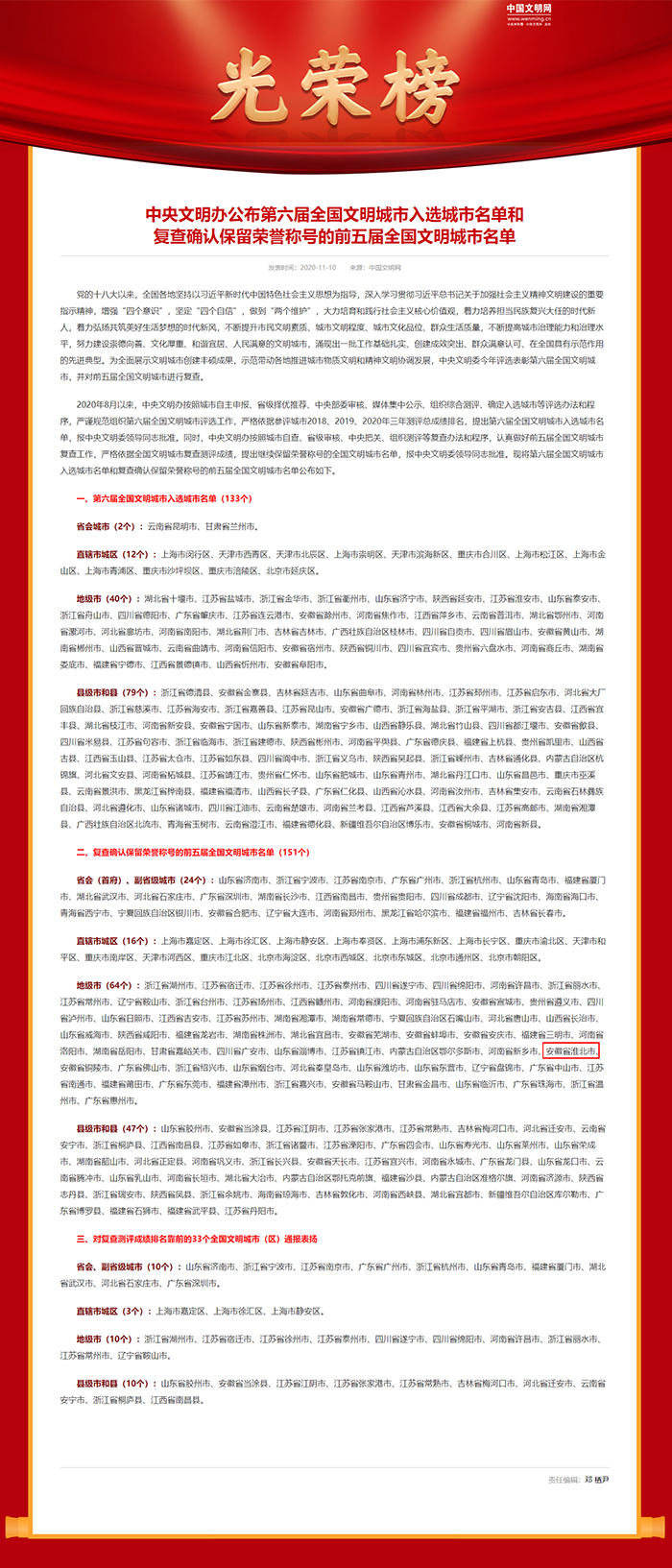 11月10日,中央文明办公布第六届全国文明城市入选城市名单和复查确认保留荣誉称号的前五届全国文明城市名单,并对复查测评成绩排名靠前的33个全国文明城市(区)通报表扬,淮北市蝉联全国文明城市!