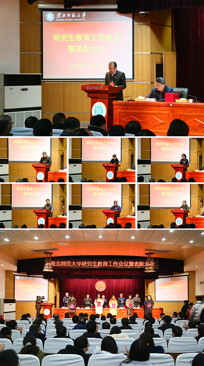 会上,校党委副书记朱德顺宣读了《淮北师范大学关于表彰师德标兵、优秀教师、优秀教育工作者和优秀辅导员的决定》、《淮北师范大学关于表彰研究生教育先进集体和先进个人的决定》。出席会议的校领导分别为学校2020年研究生国家奖学金获得者、2018-2019年度师德标兵、优秀教师、优秀教育工作者和优秀辅导员;研究生教育先进集体和先进个人颁发了奖状。研究生教育先进集体代表、教育学院院长王家云;研究生教育先进集体代表、物理与电子信息学院院长李素文;优秀研究生管理工作者代表、生命科学学院党委书记李琴;优秀研究生指导教师代表、文学院教师任强;优秀研究生辅导员代表、化学与材料科学学院韩满意;教师代表、教育学院蔺红春分别做了大会发言。