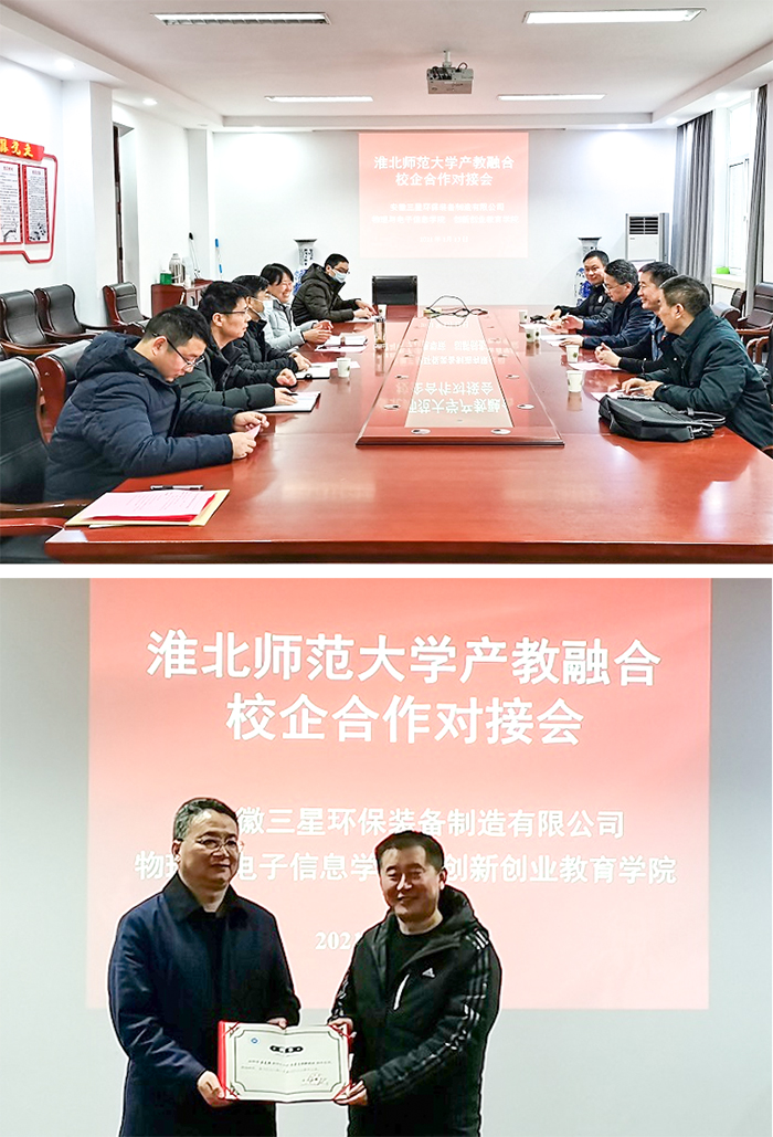 1月13日下午,学校在物理与电子信息学院召开了产教融合校企合作对接会。校党委常委、副校长李福华,安徽三星环保装备制造有限公司董事长吴光明,物理与电子信息学院、创新创业教育学院负责人等参加了对接会。会议由物理与电子信息学院负责人主持。