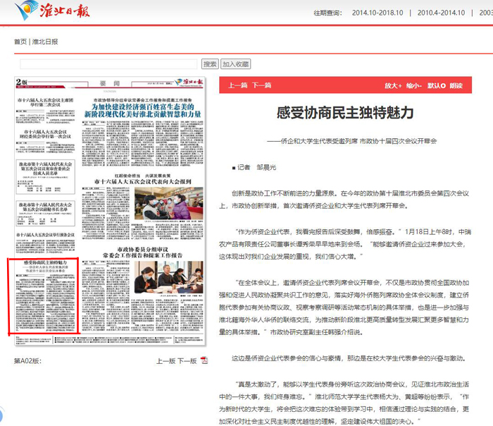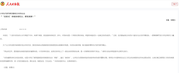 1月25日,《人民政协报》、《淮北日报》报道我校大学生代表列席安徽淮北市政协全会。