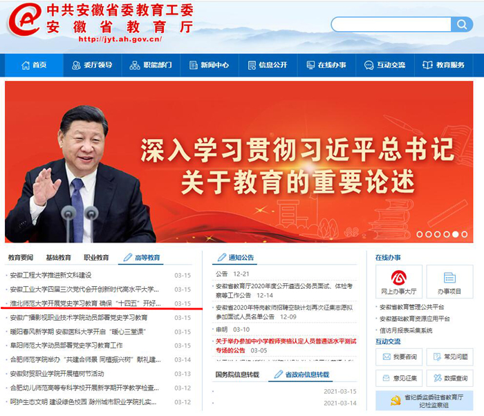 【安徽教育网】首页:淮北师范大学开展党史学习教育 确保“十四五”开好局起好步 来源:党委宣传部 发布时间:2021-03-15 16:15:50 浏览次数: 次 【字体:小 大】 近日,我校党委理论学习中心组理论学习研讨(扩大)会议暨学期初工作会议在相山校区召开。3月15日,安徽教育网首页对此进行了报道。链接地址:http://jyt.ah.gov.cn/xwzx/gdjy/40412413.html 分享到: 【打印正文】