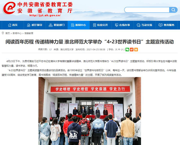 【安徽教育网】首页: 阅读百年历程 传递精神力量 淮北师范大学举办“4·23世界读书日”主题宣传活动