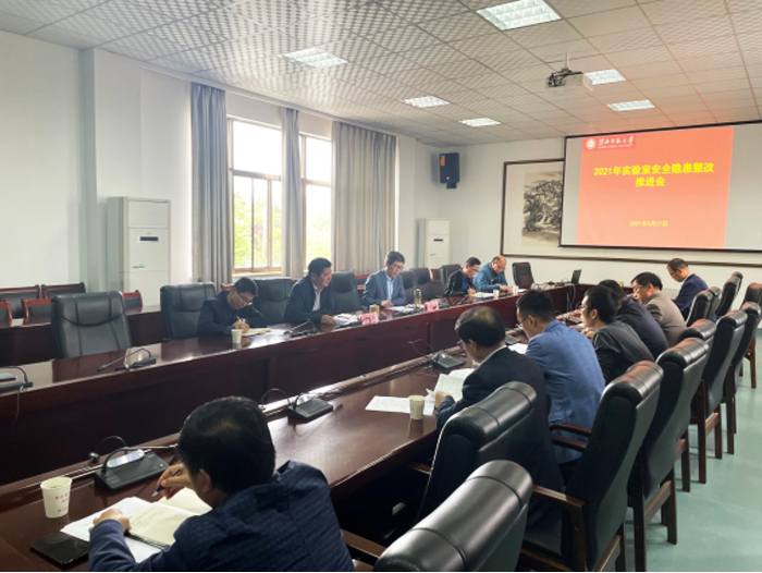 安全隐患整改推进会召开前,学校已于5月初根据《安徽省教育厅关于组织开展2021年度高等学校实验室安全检查工作的通知》要求,组织相关单位开展了实验室安全自查自纠;5月8日,余敏辉带领职能部门人员到重点实验场所开展了现场安全检查,并要求对安全隐患制定针对性方案。整改推进会上,余敏辉首先传达教育部实验室安全视频会议精神,国有资产与实验室管理处汇报了2021年度实验室安全检查情况,存在实验室安全隐患的各责任单位汇报了隐患整改方案,相关职能部门结合部门职责给予了回应,表示将积极推进落实问题整改。