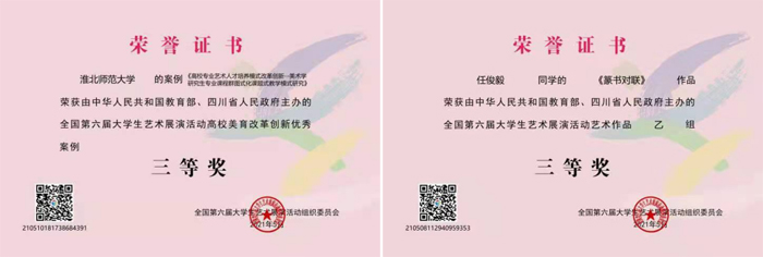 自大赛启动以来,分管校领导高度重视,下发了《关于印发淮北师范大学落实安徽省第六届大学生艺术展演活动方案》,要求组织到位、落实到位,重点在节目质量、精神风貌、节目层次等方面下功夫。本次展演中书法作品《篆书对联》、高校美育改革创新优秀案例《高校专业艺术人才培养模式改革创新——美术学研究生专业课程群图式化课题式教学模式研究》2件作品荣获国赛三等奖。
