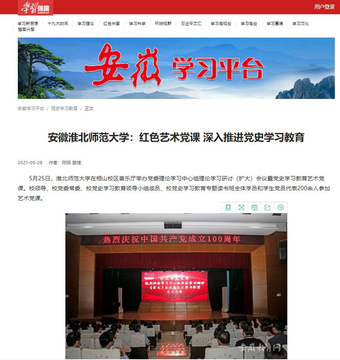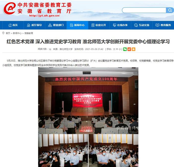 《淮北新闻联播》、学习强国、安徽教育网首页报道我校举办党委理论学习中心组理论学习研讨(扩大)会议暨党史学习教育艺术党课