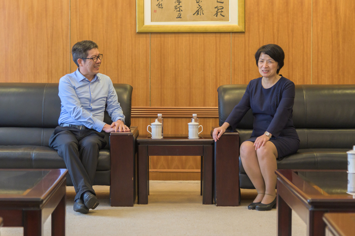 华东师大党委书记梅兵热情接待姚佐文一行,姚佐文对华东师范大学的支持和帮助表示感谢,并就师范类高校发展、两校合作等事宜深入交流意见。