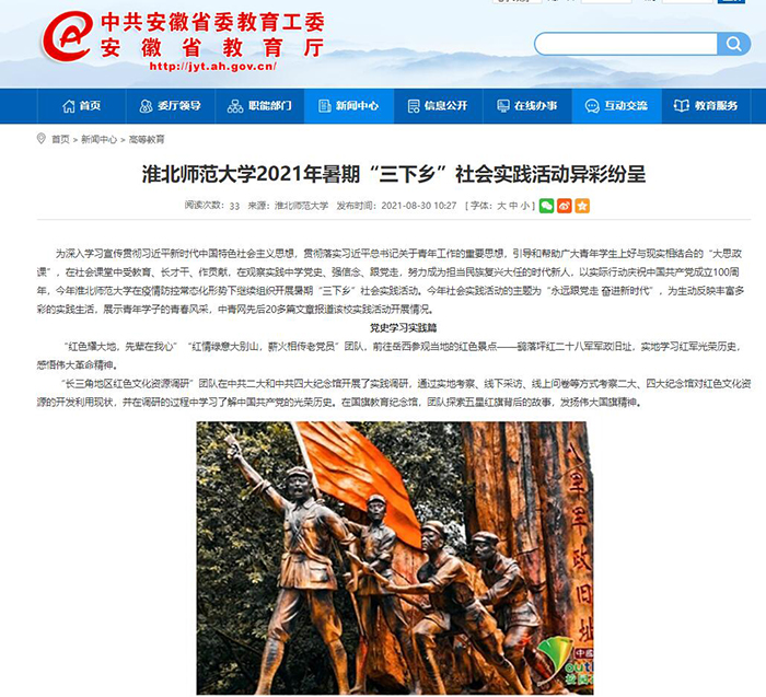 【安徽教育网】首页:淮北师范大学2021年暑期“三下乡”社会实践活动异彩纷呈 来源:党委宣传部 发布时间:2021-09-02 17:02:06 浏览次数: 次 【字体:小 大】 8月30日,安徽教育网首页以《淮北师范大学2021年暑期“三下乡”社会实践活动异彩纷呈》为标题报道我校暑期社会实践活动亮点。链接地址:http://jyt.ah.gov.cn/xwzx/gdjy/40462311.html 分享到: 【打印正文】