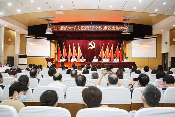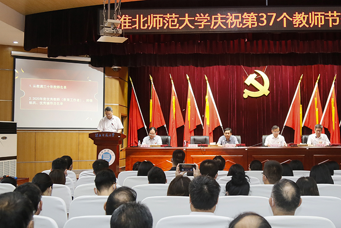 陈士夫代表校党委、校行政向全校广大教职工致以节日的问候,向离退休老同志致以崇高的敬意,向从教三十年的同志表示衷心的祝福,向受到表彰的各位老师表达热烈的祝贺,向新入职的青年教师表示诚挚的欢迎。陈士夫高度评价了全校广大教师为学校发展作出的贡献,他指出:“三寸粉笔,三尺讲台系国运;一颗丹心,一生秉烛铸民魂。一直以来,全校广大教职工献身教育事业,在平凡的岗位上,忠于职守、辛勤工作,默默耕耘、兢兢业业,勇担学生成长成才引路人的重任,为培养一批又一批淮师大学子、为学校事业改革发展,作出了巨大的贡献。”