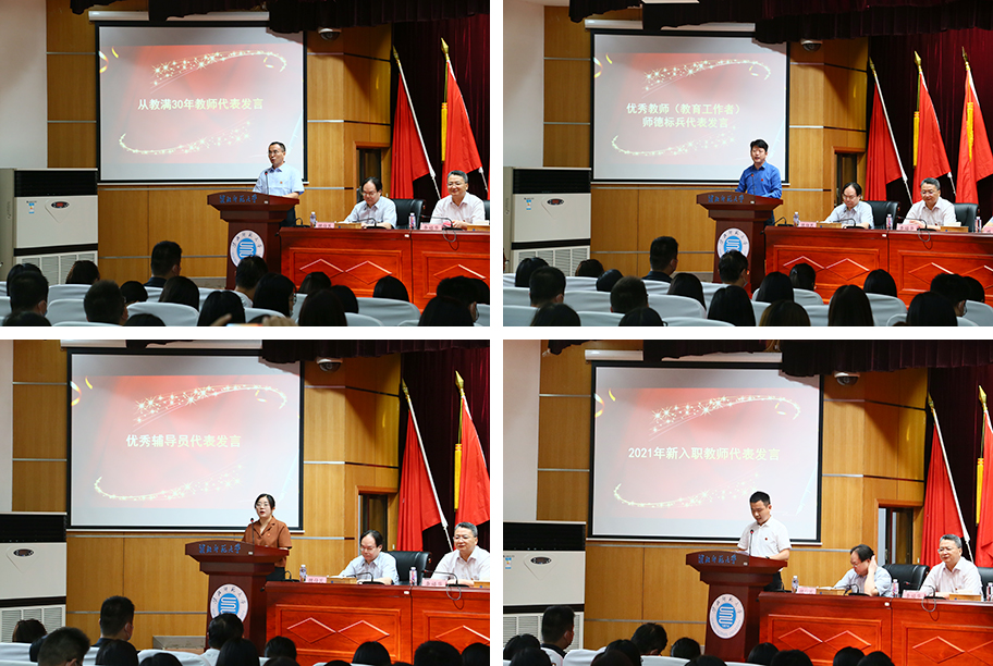 优秀教师(教育工作者)、师德标兵代表、教育学院梅松竹博士,优秀辅导员代表、化学与材料科学学院朱丽丽,新入职教师代表、物理与电子信息学院杨波博士先后发言。