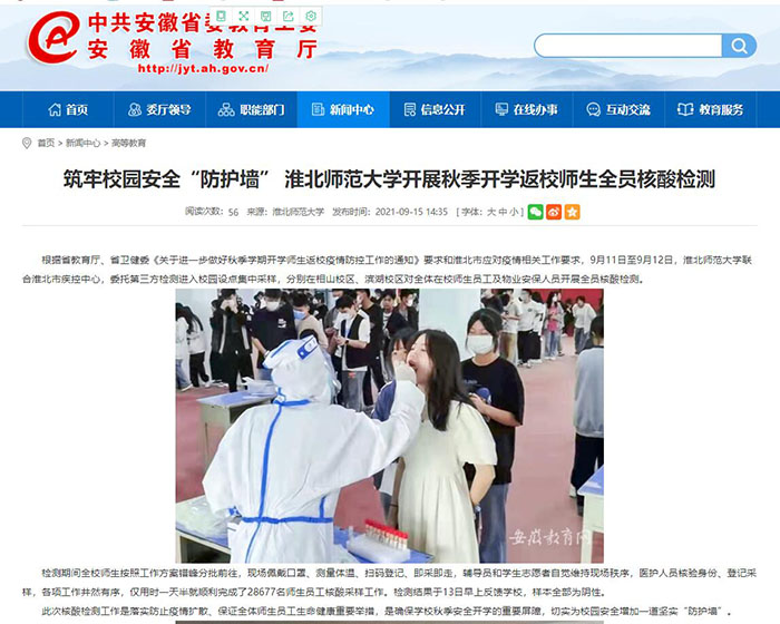 【安徽教育网】首页:筑牢校园安全“防护墙” 淮北师范大学开展秋季开学返校师生全员核酸检测 来源:党委宣传部 发布时间:2021-09-16 15:16:10 浏览次数: 次 【字体:小 大】 9月11日至9月12日,我校联合淮北市疾控中心,委托第三方检测进入校园设点集中采样,分别在相山校区、滨湖校区对全体在校师生员工及物业安保人员开展全员核酸检测。安徽教育网首页对此进行了报道。链接地址:http://jyt.ah.gov.cn/xwzx/gdjy/40468529.html 分享到: 【打印正文】