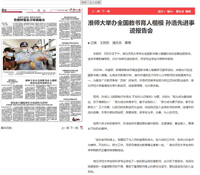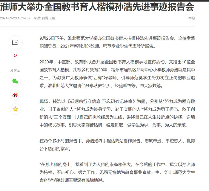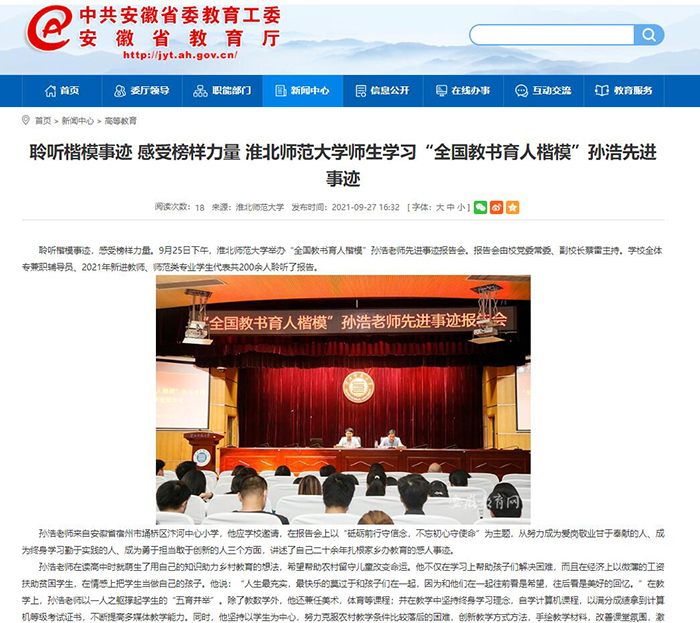 9月25日下午,我校举办“全国教书育人楷模”孙浩老师先进事迹报告会。安徽教育网、淮北新闻联播、《淮北日报》、淮北新闻网、安青传媒等媒体分别对此进行了报道。