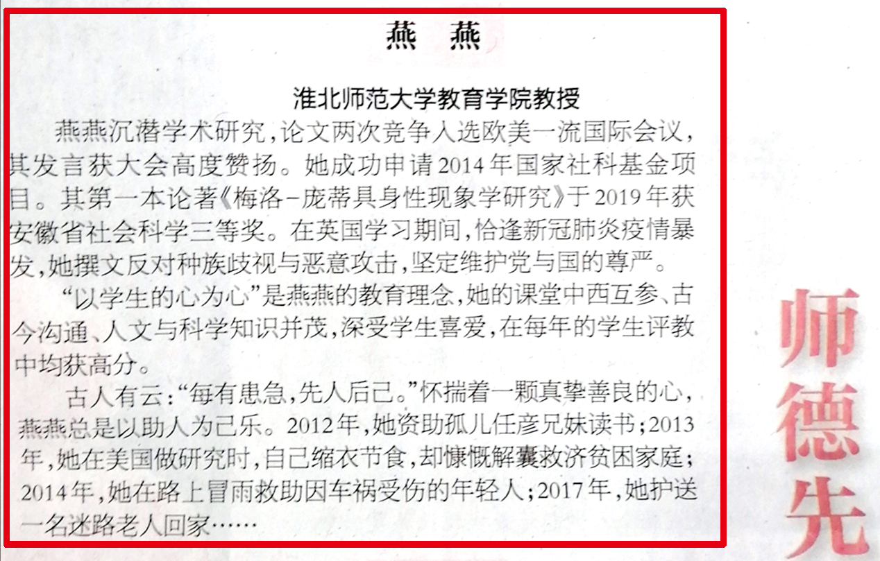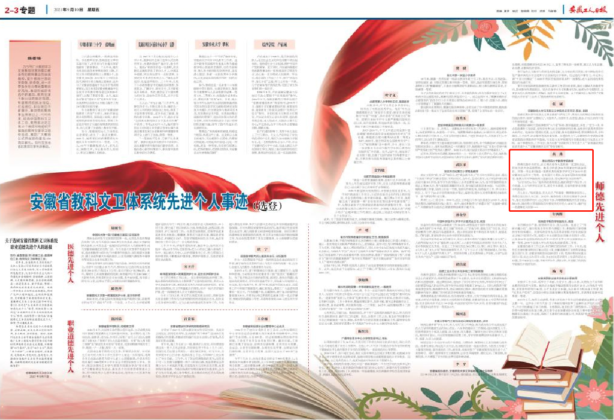 为引导广大教师学习发扬教育世家热爱并献身党的教育事业的崇高精神,提升教育世家的荣誉感、获得感,进一步营造全社会尊师重教良好风尚,推动形成好教师不断涌现、教育世家不断出现的良好局面,彰显教师的政治地位、社会地位、职业地位不断提升,推动党的教育事业蒸蒸日上、代代传承,经商中国教科文卫体工会,教育部决定在第37个教师节前组织开展首批教育世家学习宣传活动,激励广大教师以优异成绩向建党100周年献礼。安徽省教科文卫体工会积极组织开展“师德先进个人”评选活动,《安徽工人日报》2021年9月10日第3版刊登部分先进个人事迹,我校教育学院燕燕教授获此殊荣。