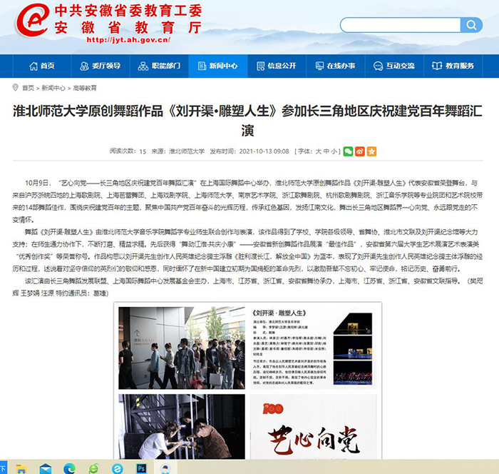 10月9日,“艺心向党——长三角地区庆祝建党百年舞蹈汇演”在上海国际舞蹈中心举办,我校原创舞蹈作品《刘开渠·雕塑人生》代表安徽省荣登舞台。安徽教育网首页进行报道。