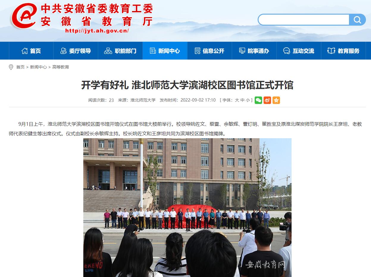 【安徽教育网】开学有好礼 淮北师范大学滨湖校区图书馆正式开馆 来源:党委宣传部 发布时间:2022-11-08 08:08:19 浏览次数: 次 【字体:小 大】 9月1日上午,淮北师范大学滨湖校区图书馆开馆仪式在图书馆大楼前举行。校领导姚佐文、蔡雷、余敏辉、曹灯明、翟胜宝及原淮北煤炭师范学院院长王彦坦、老教师代表纪健生等出席仪式。仪式由副校长余敏辉主持。校长姚佐文和王彦坦共同为滨湖校区图书馆揭牌。安徽教育网进行了关注和报道。链接地址:http://jyt.ah.gov.cn/xwzx/gdjy/40594492.html 分享到: 【打印正文】