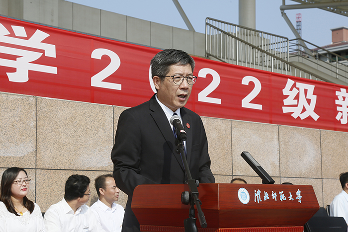 校党委副书记、校长姚佐文代表学校向全体2022级新同学的到来表示热烈的欢迎和衷心的祝贺,向辛勤培育学生的家长和老师们致以诚挚的感谢和崇高的敬意。他带领大家深情回顾了淮北师范大学40多年的办学历程,并向新同学提出三点希望:一要不忘初心,追求理想信念的高度。要树立远大理想,明确奋斗目标,继续筑梦远航。要有大胸怀、大追求、大境界,高昂青春之朝气、青春之豪情,拥抱时代、拥抱梦想,立志做行业的中坚、时代的骄子,努力把自己锻炼成为党和人民所需要的、符合时代要求的社会主义建设者和接班人,为实现中华民族伟大复兴的中国梦贡献力量。二要坚定信心,保持不懈奋斗的力度。秉承“艰苦奋斗、持之以恒、甘于奉献、追求卓越”的淮师大精神,恪守“博学、慎思、励志、敦行”的校训,弘扬“敬业、奉献”的校风,坚持“知行合一、学做真人”的学风,修炼内心境界,提升意志韧度,坚定自信,提高境界,拓展胸襟,完善人格。三要始终专心,加快追逐梦想的速度。要专心读书,多读书,读好书,潜心研读,持之以恒,拓宽眼界胸襟,培养理性思维和创新精神。要专心做事,培养面对困难的勇气、解决困难的能力,让所有的困难都成为自己脚下的高山,让自己能远眺未来的风光。要坚持正确的方向,避免“毫厘千里”之误;坚持正常的步伐,以免“欲速不达”之困。用实际行动响应伟大的时代召唤,用不懈奋斗践行伟大的事业期待,不负时代重托、不负青春韶华,创造更加壮美的青春业绩。