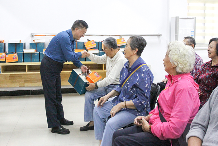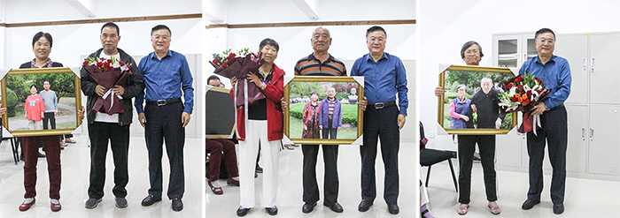 曹灯明为三对金婚夫妇送上纪念照和鲜花,并合影留念。向80周岁和70周岁退休职工献上生日蛋糕和美好祝福。