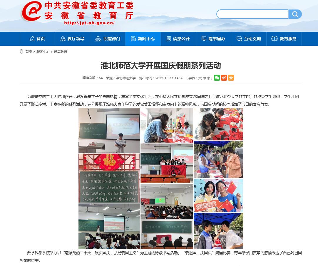 为迎接党的二十大胜利召开,激发青年学子的爱国热情,丰富节庆文化生活,在中华人民共和国成立73周年之际,我校各学院、各校级学生组织、学生社团开展了形式多样、丰富多彩的系列活动,充分展现了青年学子的爱党爱国情怀和奋发向上的精神风貌,为国庆期间的校园增加了节日的喜庆气氛。中国网、安徽教育网对此进行了报道。
