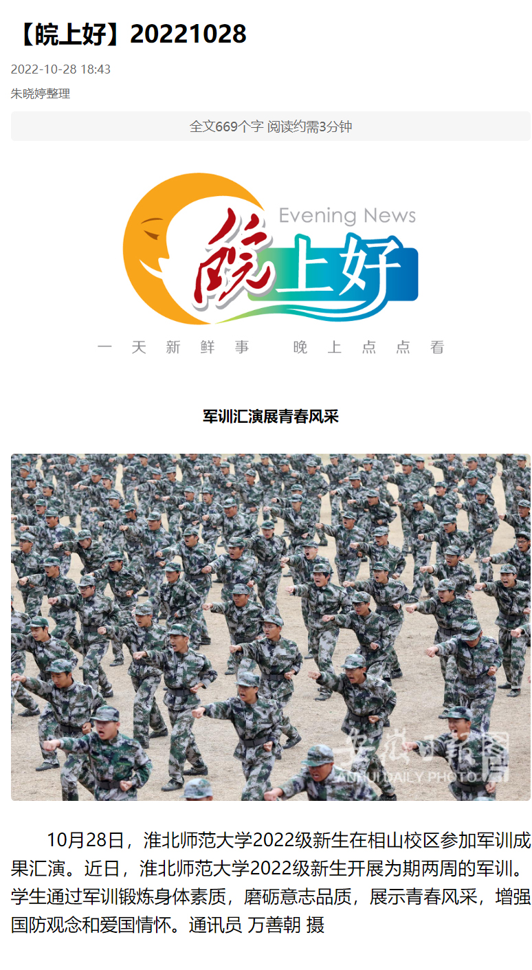 《安徽日报》客户端报道我校军训汇演 来源:党委宣传部 发布时间:2022-11-04 17:04:38 浏览次数: 次 【字体:小 大】 10月28日,我校2022级新生在相山校区参加军训成果汇演。学生通过军训锻炼身体素质,磨砺意志品质,展示青春风采,增强国防观念和爱国情怀。《安徽日报》客户端对此进行了报道。链接地址:https://app.ahnews.com.cn/displayTemplate/news/newsDetail/129/699323.html?isShare=true 分享到: 【打印正文】