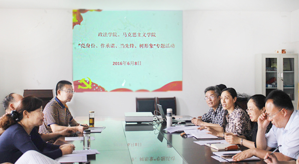 为推动“两学一做”学习教育活动深入扎实开展,引导全院教工党员立足岗位作贡献,充分发挥先锋模范作用,6月8日下午,政法学院教工党支部在学院会议室开展了“亮身份、作承诺、当先锋、树形象”专题活动。全体教工党员参会,会议由教工党支部书记杨德志主持。