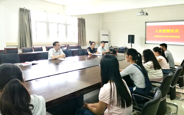 6月8日,计算机科学与技术学院党委在学院会议室召开庆祝建党95周年暨新党员入党宣誓大会。学院党委书记胡少锋,学生各党支部书记、委员,新加入党组织的预备党员参加了宣誓大会。大会由学生第三党支部书记赵娟主持。