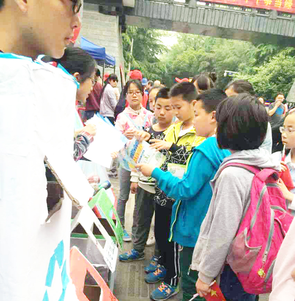 在了解完理论的知识之后,就要大家动起手来了,所以本次活动的最后一项内容——变废为宝手工展及拍卖大会应运而生。化工二班专业的学生分成几个小组教同学们制作“垃圾”手工艺,有手工扇、小纸人、蝴蝶结、树叶小人和纸花等。在确定分组之后,“垃圾”手工艺制作大赛正式拉开帷幕,化工二班的同学们认真地教授大家制作方法,小朋友们也十分认真地听“老师们”的讲解,按照他们的步骤进行制作。于是,一个个精美的小工艺品,就在他们的手中诞生了。最后化工二班的团支书张文杰宣布,最终工艺品不回收,留给同学们收藏,作为自己美好的回忆。