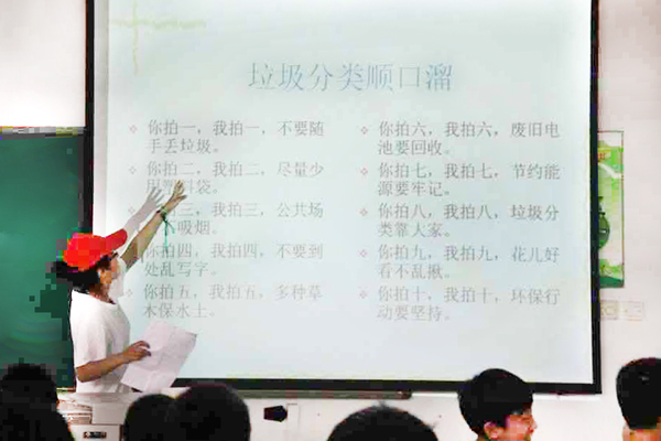 在播放一段关于蜡笔小新垃圾分类的视频之后,化工二班的同学们教给小学生们关于垃圾分类的顺口溜,并用顺口溜完成垃圾分类接龙表。在“你拍一,我拍一,不要随手丢垃圾;你拍二,我拍二,尽量少用塑料袋……”的顺口溜声中,游戏如火如荼的进行着。记者观察到,不管是大朋友还是小朋友,大家的脸上都洋溢着快乐和幸福。