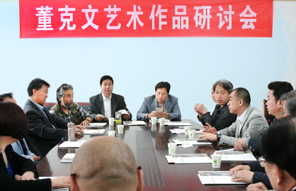开幕仪式结束后,大家一同前往美术学院展厅观看董克文的临摹壁画作品。部分特邀艺术家在美术学院会议室围绕展览主题,从中国优秀传统壁画的艺术价值、壁画描绘技法、临摹与创作的关系、理论研究和艺术实践的关系、董克文艺术成长道路、董克文未来专业发展取向等方面踊跃发言、热烈交流、认真研讨,会场洋溢着浓厚的学术氛围。