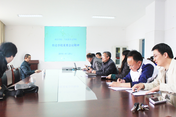 4月20日下午,政法学院、、马克思主义学院召开全体教职工例会,传达学习校2016年党风廉政建设会议和校第一次党代会2016年年会暨八届一次 “两代会”会议精神。会议由院长石振保主持。