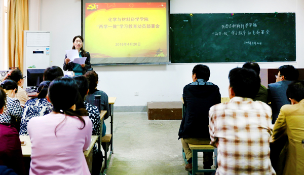 4月20日下午,化学与材料科学学院召开全体党员大会,学习贯彻校党委“两学一做”动员会议精神,部署安排了学院内“两学一做”学习教育工作。会议由学院党委书记李琴主持。