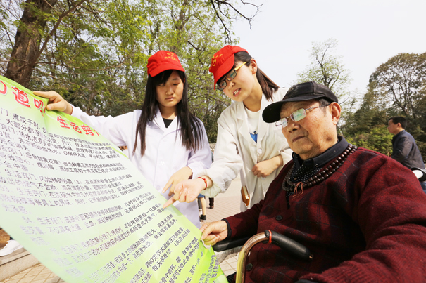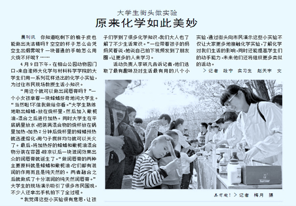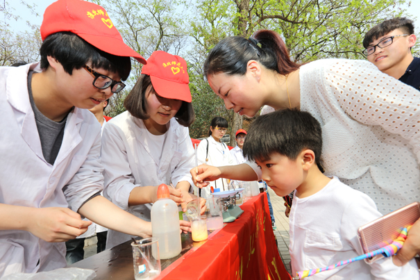 4月9日下午,在相山公园动物园门口,来自淮师大化学与材料科学学院的大学生们用一系列花样迭出的化学小实验,为过往市民现场教授生活小知识。