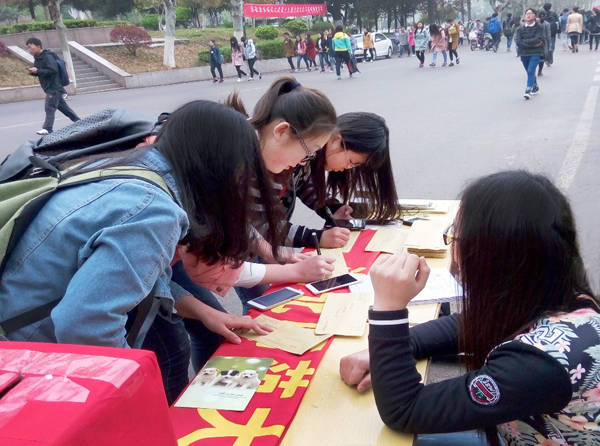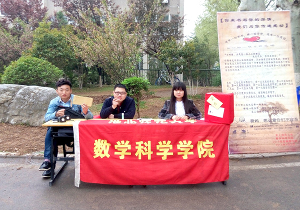 你来书写你的深情,我们为你传递感动。4月6日-12日,由数学科学学院团委主办, 2013级数学与应用数学(金融数学)团支部承办的“家书抵万金”团日活动在校主干道旁如火如荼地开展,吸引众多淮师学子驻足参加。