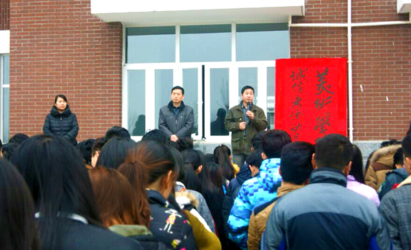 12月9日下午于文源楼东侧小广场召开了美术学院诚信考试动员暨宣誓大会。院领导、辅导员和全院学生参加大会。会议由团委书记胡天佼老师主持,院领导陈伟老师进行诚信考试动员,赵辉老师解读《美术学院学生诚信考试工作规程》并强调了《学生手册》中有关考试违纪的处罚规定。随后,学生代表发言,院学生会主席带领大家进行诚信考试宣誓。大会要求,每一位学生都要勤奋好学,积极备考,做一个自警自律、自尊自爱、积极上进、文明守纪的好学生。