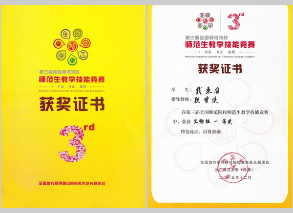 12月4日至6日,由全国地方高等师范院校教务处长联席会主办,浙江师范大学承办的第三届全国师范院校师范生教学技能竞赛在浙江师范大学举行。我校生命科学学院2013级生物科学专业戴秉国同学不畏强手、发挥出色,以扎实的知识功底和过硬的教学技能荣获生物组一等奖。