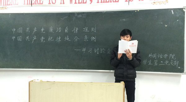 外国语学院认真贯彻校党委有关部署,扎实开展“十八届五中全会精神”暨《中国共产党廉洁自律准则》、《中国共产党纪律处分条例》等学习活动。