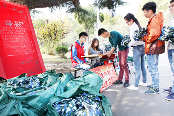 2015级新生军训总结表彰大会刚刚结束,物理与电子信息学院便积极举办了主旨为“捐献军训服,情系农民工”军训服募捐活动,以便更好地利用军服。物理与电子信息学院团委、青年志愿部、学生会部分成员和物电学院全体学生参与了此次活动。