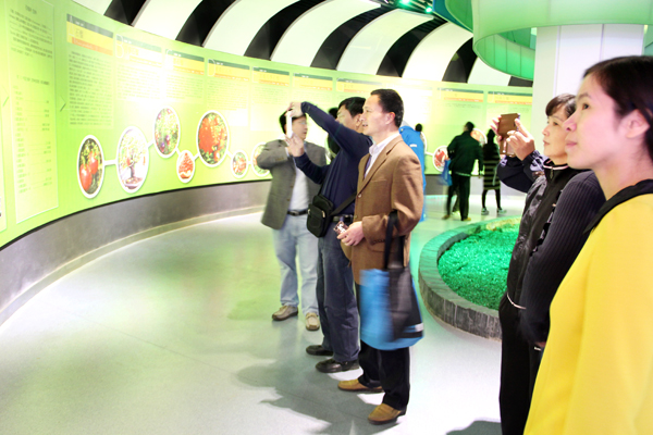 大家首先来到中国石榴博物馆,通过图片、实物、雕像以及三维影像等现代声光电手段,使大家系统地了解了石榴的起源、传播、品类、功用,以及由石榴种植衍化而出的各类产品深加工和再制造。