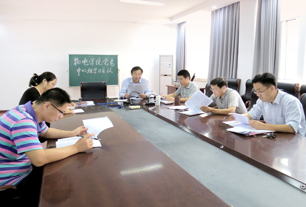 为更好地执行《中共淮北师范大学委员会理论中心组2015—2016学年第一学期理论学习安排意见》,物理与电子信息学院党委于9月24日下午在物理楼会议室召开学院全体党委委员参加的中心组学习会议。会议由物电学院党委书记田向阳主持。