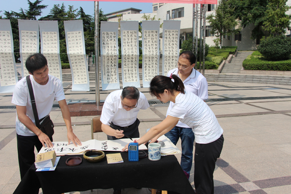 为纪念抗日战争暨世界反法西斯战争胜利70周年,9月10日,体育学院在思源广举办了师生书法展开幕式。校学工处处长王向阳、校团委书记马伟、离退处副处长张开林及体育学院党政领导出席了开幕式。开幕式上,王向阳进行了激情洋溢的讲话,对展览给予了充分的肯定和鼓励。