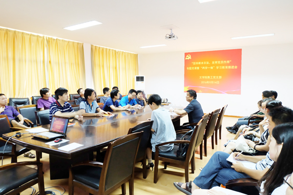 9月14日下午,文学院教工支部在文学院会议室组织开展“坚持根本宗旨,发挥党员作用”专题党课暨“两学一做”学习教育推进会。会议由教工支部书记李洁主持,党委书记吴云,院长周有斌及全体教师党员参加了会议。